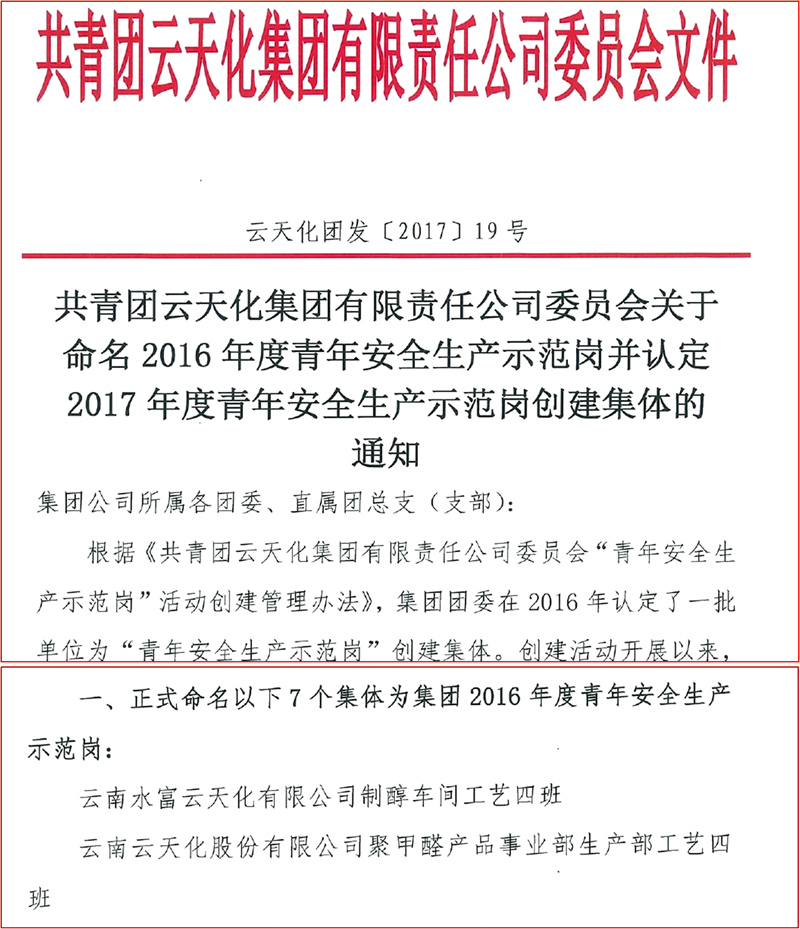 近期,云天化集团团委开展了2016年度团内先进表彰和命名2016年度青年安全生产示范岗活动,公司2个青年集体和1名个人获得集团团委表彰。