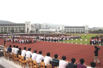 开学典礼于下午4:30分在云天化中学足球场举行,全校师生首先排着整齐的方队入场。随后在庄严的国歌声中,校园内的国旗冉冉升起。