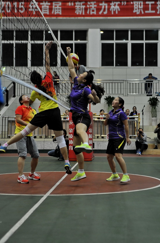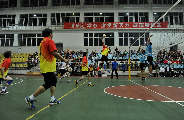 当晚的公司体育馆内灯火通明,热闹非凡,呐喊助威声不绝于耳。7时,男排决赛率先火爆上演。连续多场比赛过后,参赛队员在决赛前已经将状态调整到最佳,开场后,双方迅速进入状态,有着明显身体优势的云天化中学取得领先,而传统强队物资部男队凭借着丰富的经验稳住阵脚,将比分紧咬,但云天化中学还是通过多次有效强攻,以25:20的比分拿下第一局。易地再战,双方失误开始增多,发球出界、扣球下网、扣球出界等失误时有发生,但云天化中学依然是实力占优的一方,他们稳稳控制比赛节奏,通过一次次有效进攻逐渐将比分拉大,最终以25:11、25:14再下两城,以3:0的总分战胜物资部男队,勇夺男排桂冠。