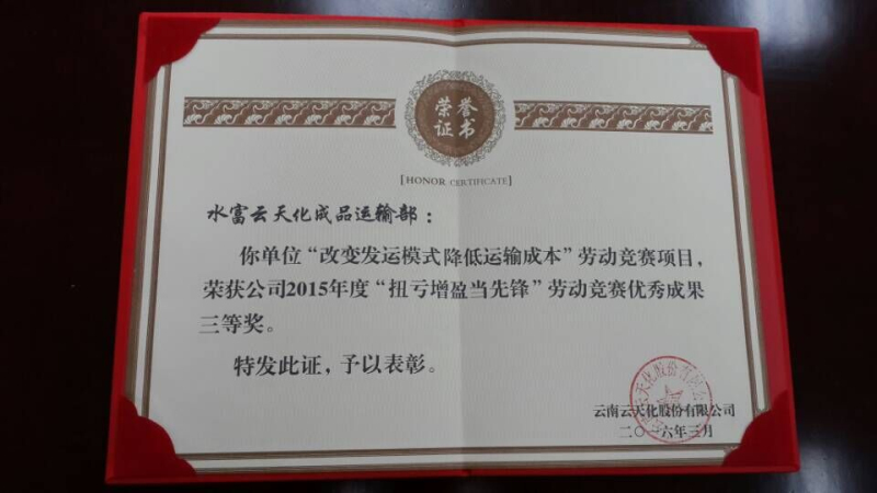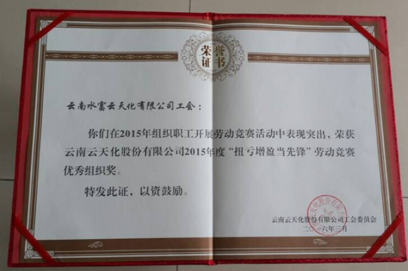 富有成效的工作受到了上级工会的认可。在此次表彰中,水富云天化荣获2015年“扭亏增盈当先锋劳动竞赛杰出团队”称号,水富云天化工会荣获2015年“扭亏增盈当先锋劳动竞赛优秀组织奖”;公司本部“百日红”劳动竞赛获“优秀成果一等奖”;云天化中学“一师一优课 班主任主题班会”和原聚甲醛车间“建功在企业 和谐促发展”两个劳动竞赛项目获“优秀成果二等奖”;成运部“改变发运模式 降低运输成本”、物资部“强化采购管理深挖掘 发挥优势降成本” 劳动竞赛项目获“获优秀成果三等奖”。