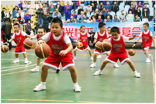 女队比赛结束后,中间休息环节,一群篮球宝贝闪亮登场。孩子们整齐划一的拍球动作以及花式篮球等的表演,给现场紧张的比赛气氛带来了轻松和欢笑。