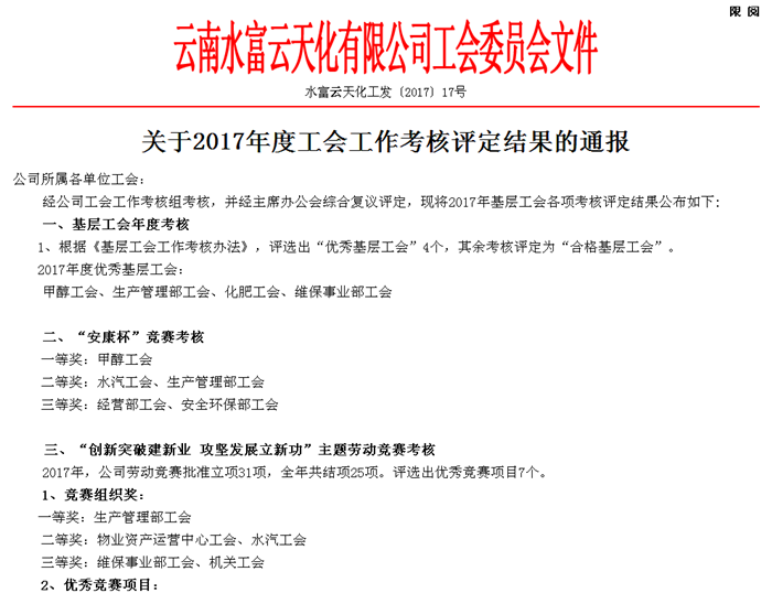 经过综合考核评定,最终甲醇、生产管理部、化肥、维保事业部四家工会被评选为“优秀基层工会”; “严格管理、科学控制,实现降本增效”、 “降低中压蒸汽放空量”等7个劳动竞赛项目被评定为优秀项目;化肥车间合成工艺三班、化肥车间合成工艺四班、化肥车间尿素工艺三班、化肥车间尿素工艺四班、甲醇车间工艺三班、水汽车间供热工艺二班、水汽车间制水工段、维保事业部检修二班、经营部转运配送班、经营部采购组、经营部销售组、经营部保管组、经营部机务班、天盛扁丝工段、云天宾馆客房班等15个班组班被评定为公司2017年度“优秀六型班组”。