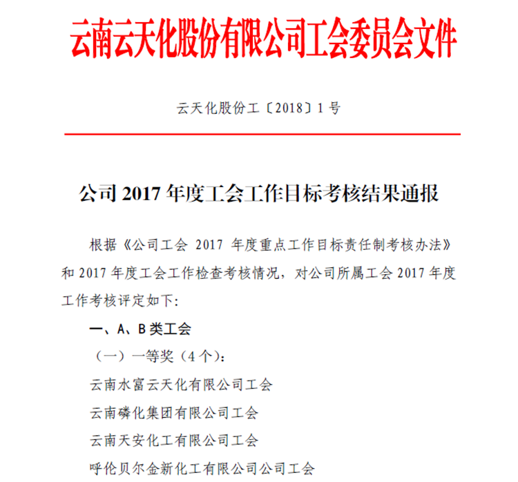 近日,云天化股份工会印发了《2017年度工会工作目标考核结果通报》,公布所属21个工会2017年度工作考核评定结果,水富云天化工会再次荣获A、B类工会目标考核一等奖。