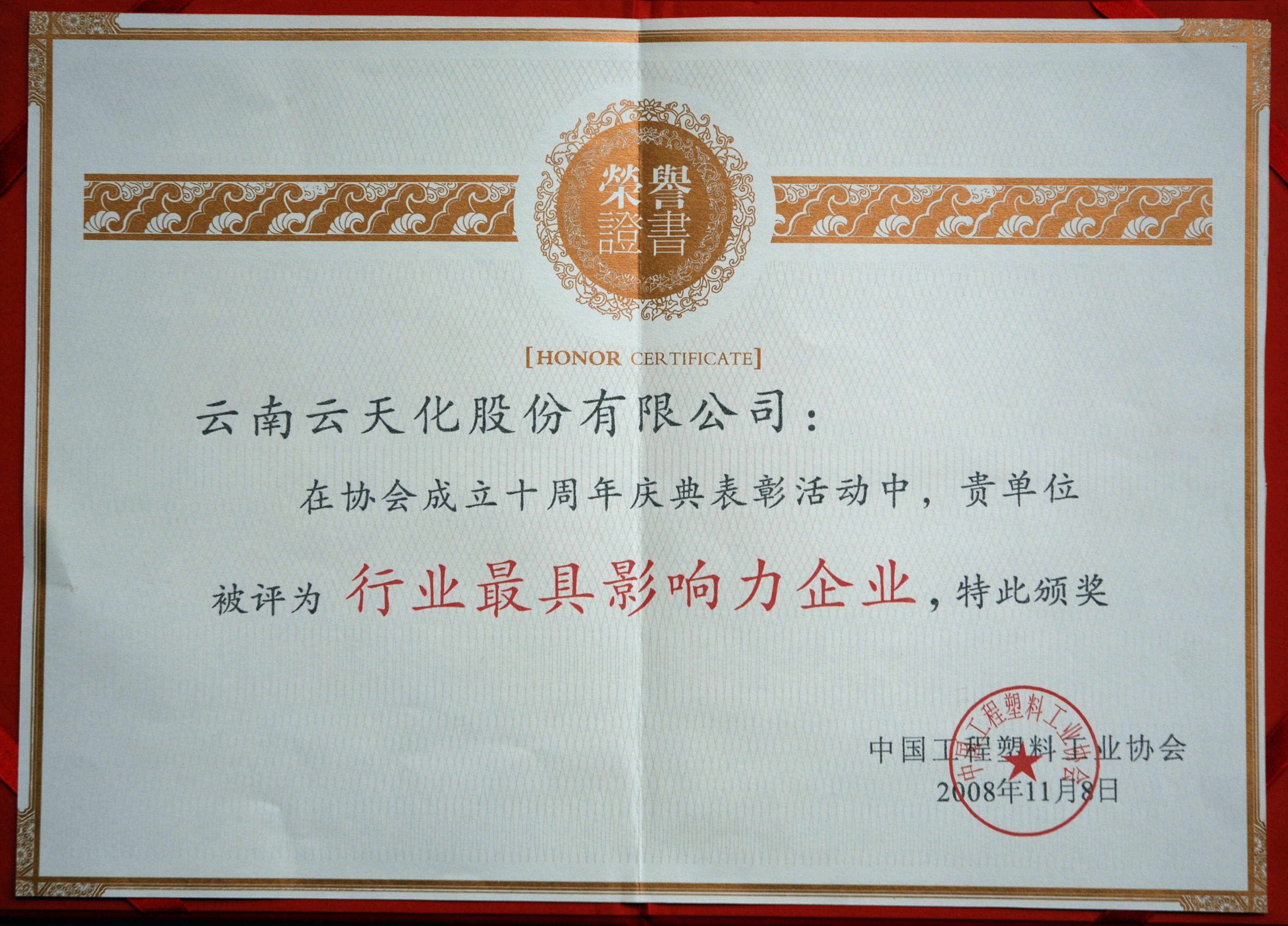 11月6―8日,中国工程塑料工业协会在浙江余姚举行会员大会暨协会成立十周年庆典活动,活动内容包括行业技术交流会、中国塑料产业发展(国际)论坛、行业先进企业表彰等。我公司凭借在聚甲醛产业内的规模和技术优势,荣获“中国工程塑料工业行业最具影响力企业”称号,受到中国工程塑料工业协会的表彰。
