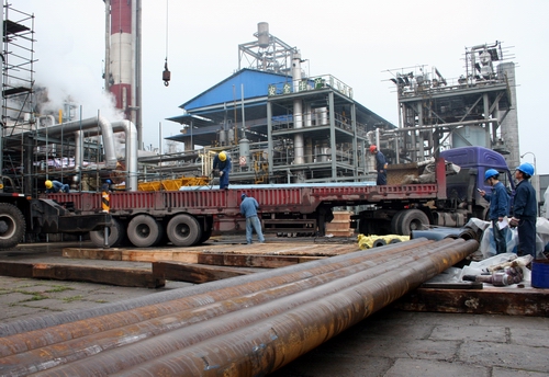 4月3日上午10:00,合成塔现场上显得异常繁忙,随着天鸿公司人员有序的吊装工作,一批新到的管材等物资被卸到了现场。