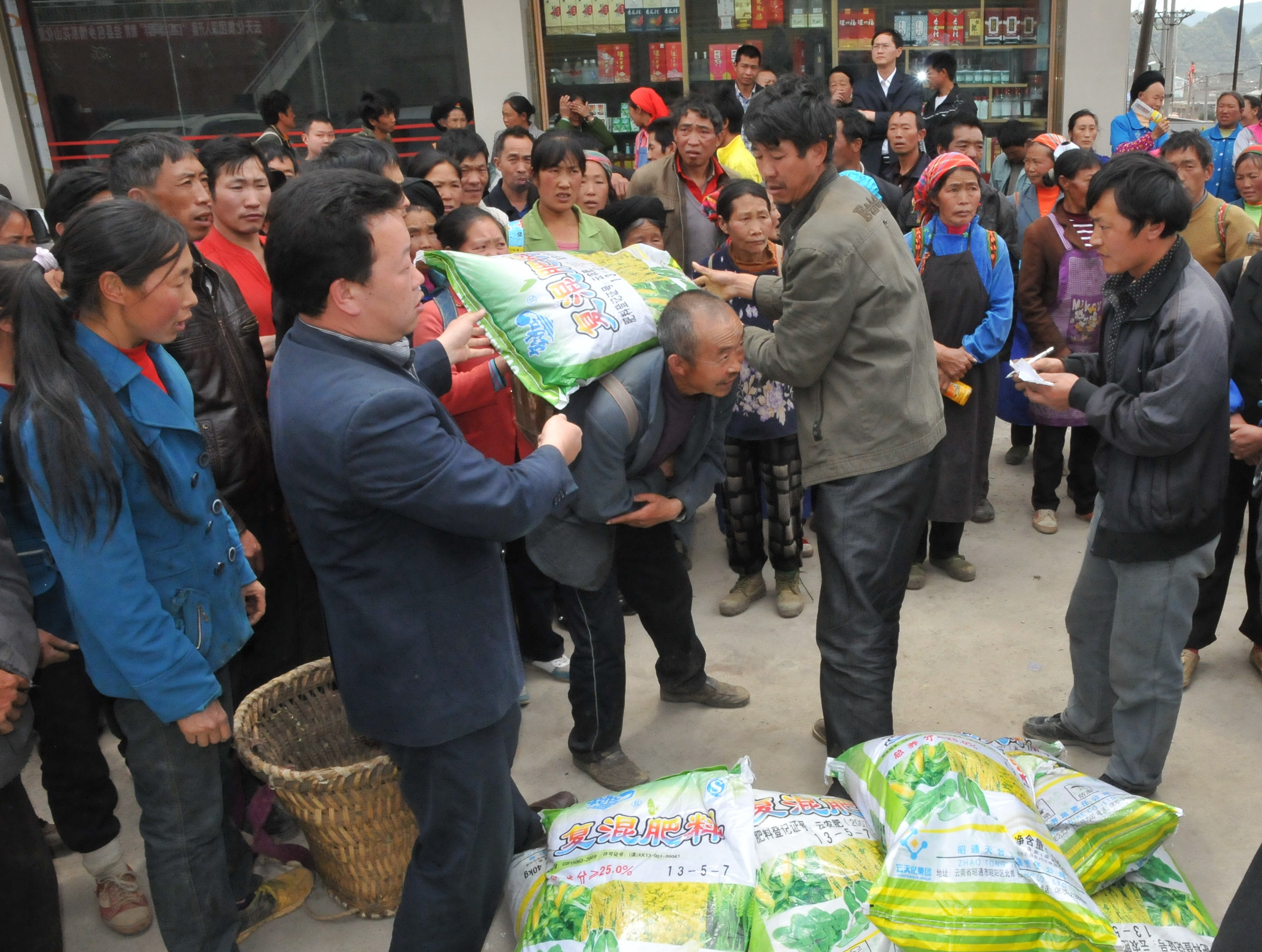 交接仪式结束后,花山乡政府随即组织各村,现场进行物资发放工作。(镇雄县花山乡党委书记 毛连荣采访:我们的分配方案是,由乡政府分配到全乡六个村,大村30吨,小村15吨。村上再进行选择农户,把最贫困的农户选来作为发放对象,我们现在选出的农户有3000多户,原则上要确保3000多户贫困群众每户都能得到一包化肥。)