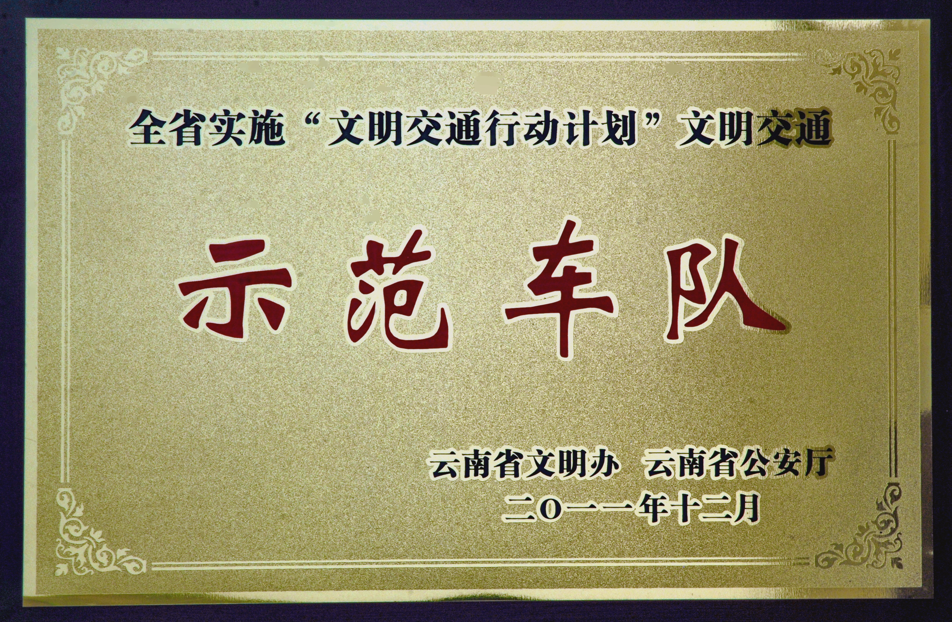 在2011年云南省“文明交通行动计划”创建活动中,公司总经理办公室车班荣获“示范车队”称号。