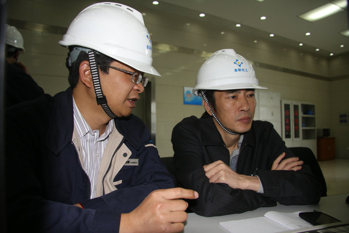 在金新化工总经理陈大文的陪同下,刘和兴、陈林先后对煤气化、型煤、蒸发塘装置的试开车和技改工作情况进行了调研了解。在现场了解了5•15事故的发生经过后,刘和兴来到煤气化主控室,听取了金新化工关于气化炉试车进展、主要困难及技改工作情况的介绍。陈林还与金新化工制气车间主任周道康就煤气化装置的具体工艺运行指标和各项参数情况进行了深入讨论。