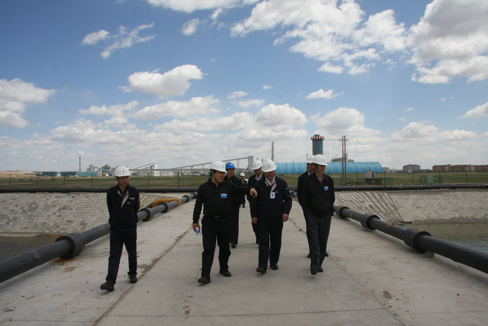 随后,刘和兴、陈林前往型煤装置,对型煤干燥机运行、设备整改、产品质量等情况进行调研。在型煤成品仓库,刘和兴拾起一块型煤,详细了解了产品的强度、水分、成型率等情况。最后,两位领导对蒸发塘装置进行了实地调研。