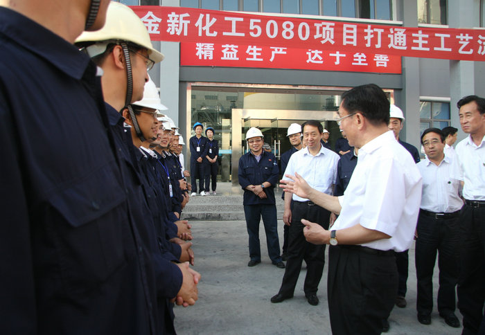 7月12日下午,中共中央政治局常委、中央纪律检查委员会书记贺国强来到金新化工视察,对金新化工项目建设和装置试生产情况进行了解,嘱咐金新化工要加大科技研发力度,在煤炭资源综合利用上发挥龙头带动作用,要求金新化工在化工试生产阶段一定要特别注意安全,勉励金新化工争取早日实现稳定运行达标达产。