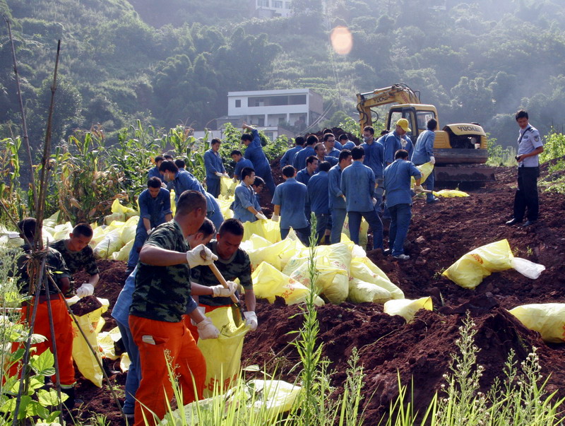 (记者:观众朋友,我现在所处的位置是麻子沟生态垃圾场,现在是8月8日下午的四点三十分,由公司组织的应急民兵抢险队伍刚刚抵达现场,他们今天将在这里进行24小时不间断作业,直至险情解除。)