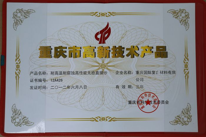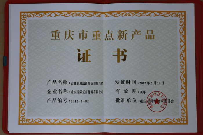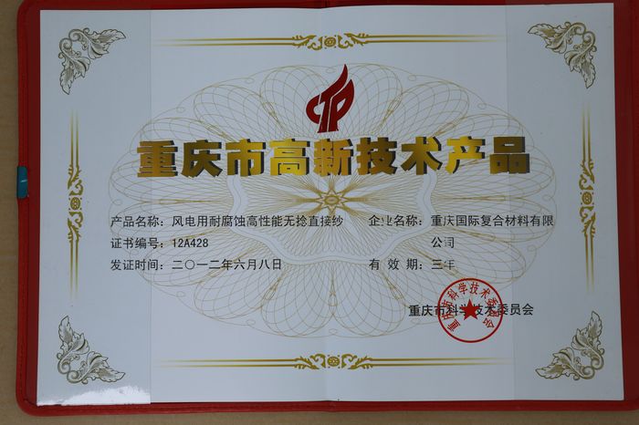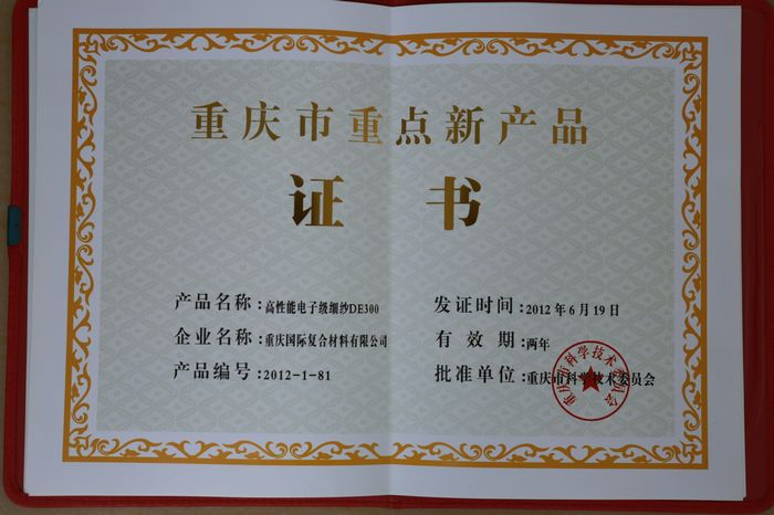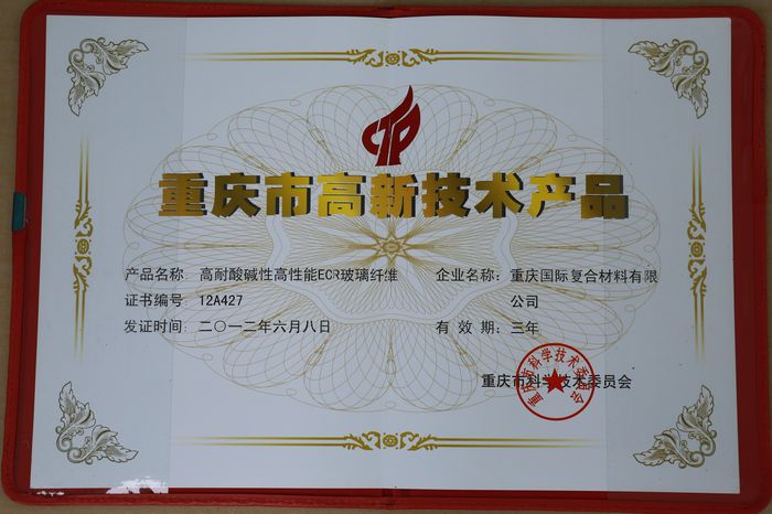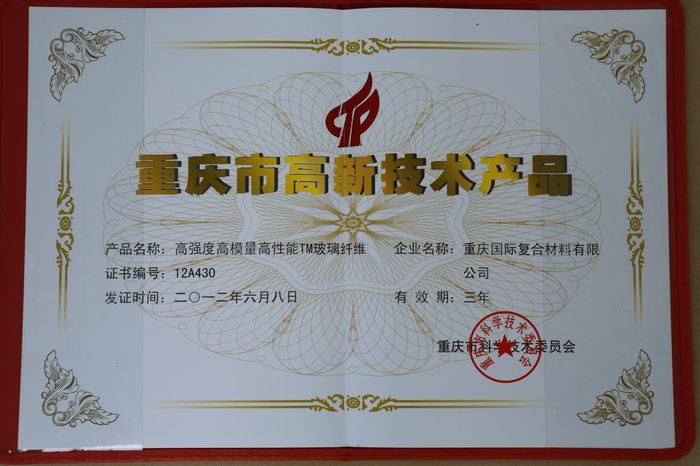 这些获奖产品名单分别是:高性能电子级细纱DE300(重庆市重点新产品)、高性能玻璃纤维短切原丝毡(重庆市重点新产品)、高耐酸碱性高性能ECR玻璃纤维(重庆市高新技术产品)、耐高温耐腐蚀高性能无捻直接纱(重庆市高新技术产品)、高强度高模量高性能TM玻璃纤维(重庆市高新技术产品)、风电用耐腐蚀高性能无捻直接纱(重庆市高新技术产品)、低成本高性能ECT无碱玻璃纤维(重庆市高新技术产品)。