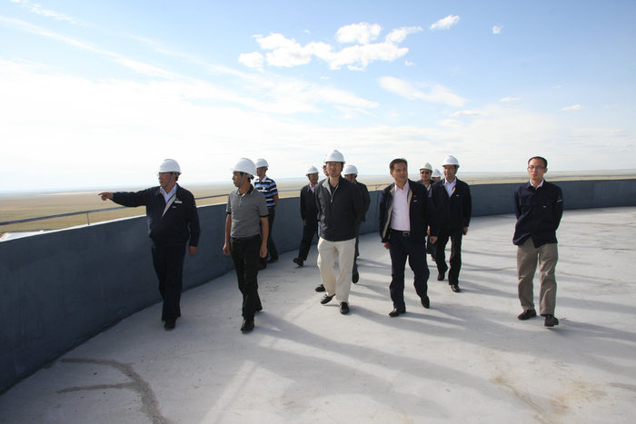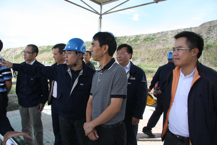 他盛华一行首先前往东明矿业进行了煤矿生产情况调研。在露天矿坑口深处,他盛华实地了解了褐煤质量、生产规模和现场生产情况。随后,他盛华一行来到金新化工了解装置试开车和企业基本情况。在尿素造粒塔顶部,金新化工总经理陈大文向他盛华详细介绍了现场装置分布、工艺流程、试生产进度等具体情况,他盛华对金新化工试车取得的成绩给予了肯定。