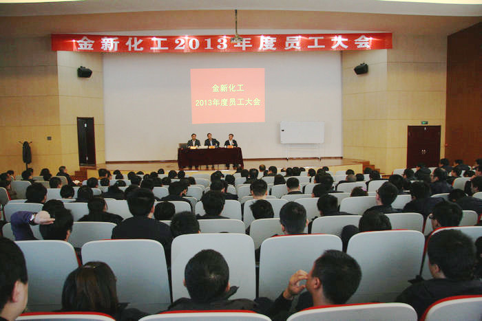 2013年3月25日,金新化工2013年度员工大会在文体中心报告厅举行。会议对今年的生产、安全等方面的工作进行了部署,提出2013年的奋斗目标。集团副总经理胡均出席会议,并在会上分析了金新化工面临的困难和问题,提出了解决困难的措施和具体实现途径。