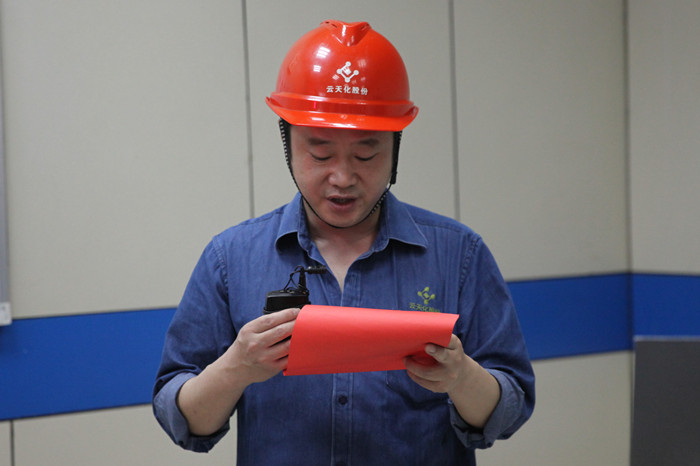 公司常务副总经理、总工程师陈林为尿素车间颁发奖金