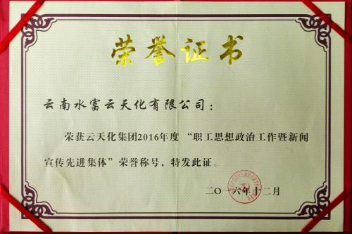 近日,集团公司公布《关于表彰2016年度职工思想政治工作暨新闻宣传奖的决定》,对2016年度职工思想政治工作暨新闻宣传先进集体、优秀宣传工作者、优秀新闻稿件(图片)进行表彰,公司获评“职工思想政治工作暨新闻宣传先进集体”称号,同时鞠华玲、吴宝夜被评为优秀宣传工作者,《陈豪到水富云天化调研强调要发挥国...