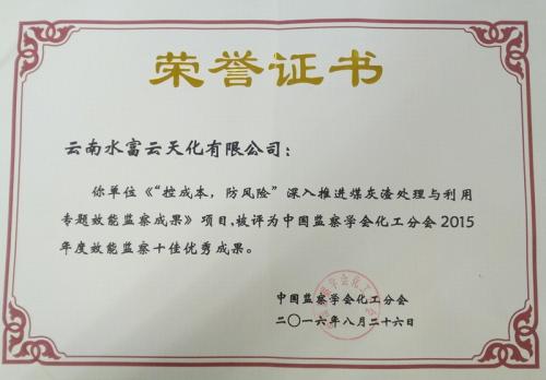 近日,在银川召开的中国监察学会化工分会2016年度年会暨“双优”评选会上,水富云天化“控成本、防风险,深入推进煤灰渣处理与综合利用专题效能监察” 项目获评年度十佳优秀效能监察成果,公司并在会上进行交流发言。 “控成本、防风险,煤灰渣处理与综合利用效能监察”项目结合企业生产经营改革重点,对煤灰...