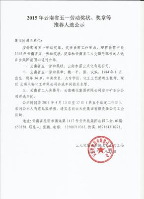 2015年云南省五一劳动奖状、奖章等推荐人选公示