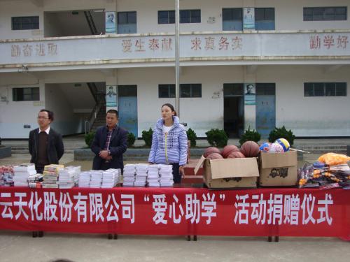 2012年11月28日下午三点,云天化荆竹坪希望小学的操场上五星红旗迎风飘扬,在庄严的国旗下举行了以“传递爱心 服务社会”为主题的天化股份“爱心助学”捐赠仪式,学校全体师生、荆竹坪村支书及云天化股份支教志愿者参加了本次捐赠仪式。 云天化股份支教志愿者来到云天化荆竹坪希望小学支教以后,在教学过程中了解...