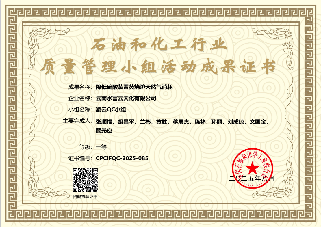 公司甲醇装置凌云QC小组完成的《降低硫酸装置焚烧炉天然气消耗》课题,在2025年全国石油和化工行业优秀成果申报中荣获质量管理小组活动一等成果,这是小组继获得云南省优秀质量管理小组称号后,再次斩获的国家级行业最高奖项。 凌云QC小组有10名成员组成,其中包括高级工程师、特级技师等专业技术人才。小组紧紧...