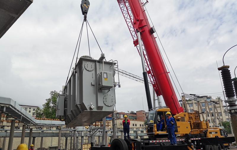 本次更换的变压器,不但空间受限,且设备重量高达48吨,对于现有吊车已经达到满负荷。加之周围全是高压线,吊车和高压线必须保证一米五的安全距离,可谓困难重重。