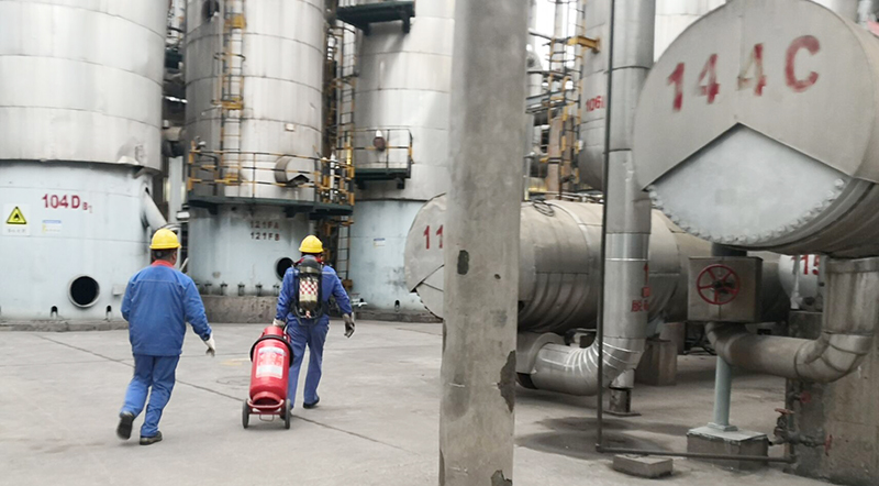 下午15时,应急演练在现场巡检人员冲进合成氨中心控制室内报告展开。演练过程中:接到报告的班组长第一时间通知公司消防救护、公司调度、并告知车间,并且立即启动《火灾事故应急救援预案》、迅速组织人员成立灭火小组开展现场灭火行动。灭火小组快速佩戴好空气呼吸器、携带上通讯工具、进入装置着火位置。来到现场,灭火人员首先对现场有无人员被困、火势大小、来风方向进行观察,另一人员迅速拉来附件灭火器对准泄漏点火焰根部进行灭火,为避免火灾事故扩大,现场人员立即联系合成氨装置中心控制人员降低装置运行负荷,降低系统压力,减小泄漏,为灭火行动提供辅助。其余人员快速蔬散现场无关人员,要求与着火位置保持安全距离。20分钟后,泄漏得到有效控制和消除,紧张有序的演练结束。车间安全员、相关岗位技术员观摩了此次应急演练。