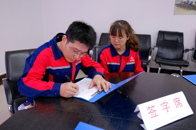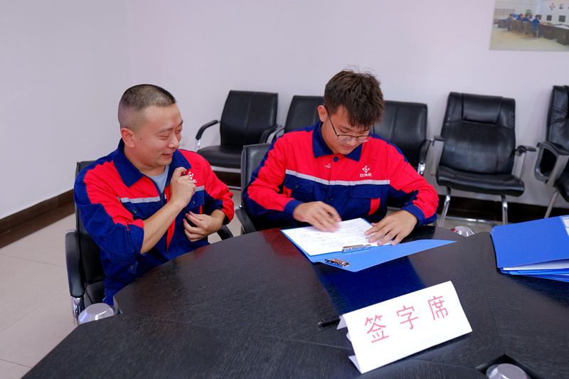 化肥车间2022年5名新进员工在经过为期一周的集中培训后将分配到各个工艺班组进行学习锻炼。为帮助新员工尽快适应工作环境,切实助推车间队伍建设,7月15日下午,化肥车间在车间会议室举行了“名师带徒”传承“工匠精神”的新员工集中签字仪式,车间领导、班组长、技术骨干代表参加了本次签字仪式。