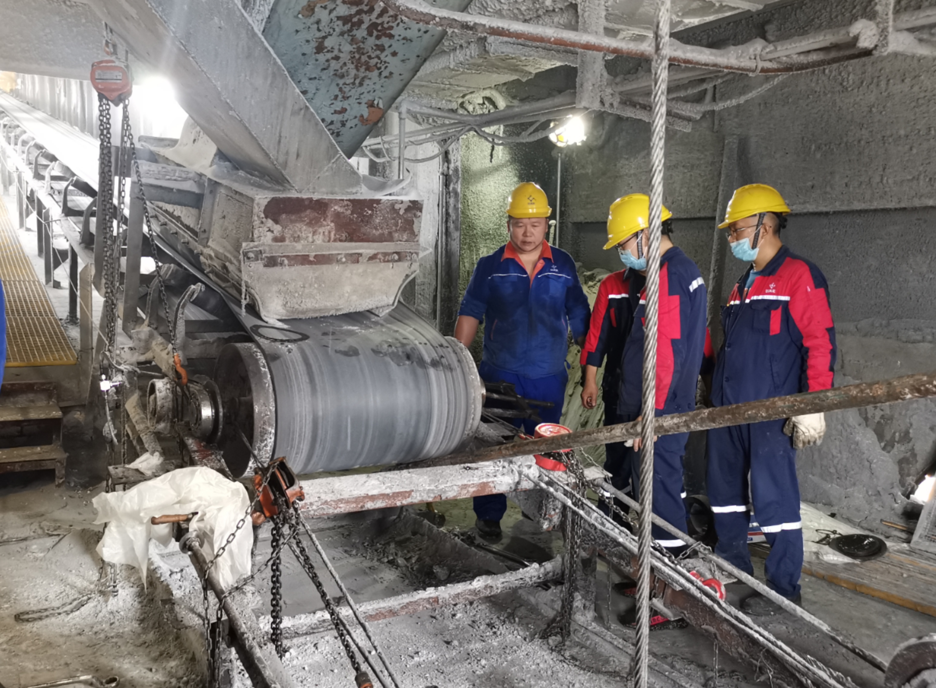 按照方案要求,工艺人员将蒸发系统打循环、停下皮带系统并断电,在工艺人员的配合下,检修人员立即对2号皮带从动轮及故障滚筒进行紧急抢修处理。整个抢修过程可谓是一波三折,最终检修人员克服空间狭窄、粉尘较大等诸多困难,在时间节点内顺利完成了整个抢修任务。