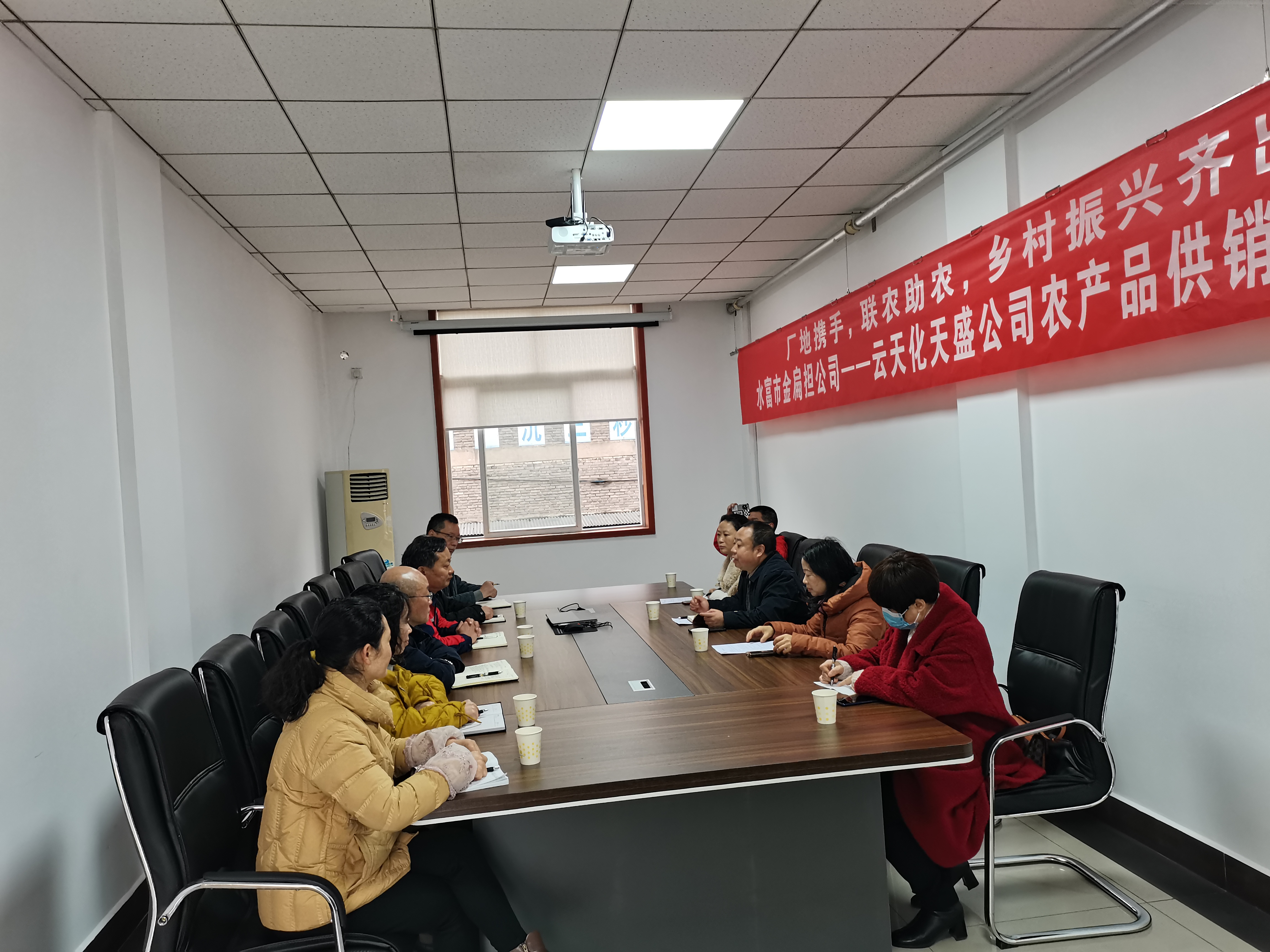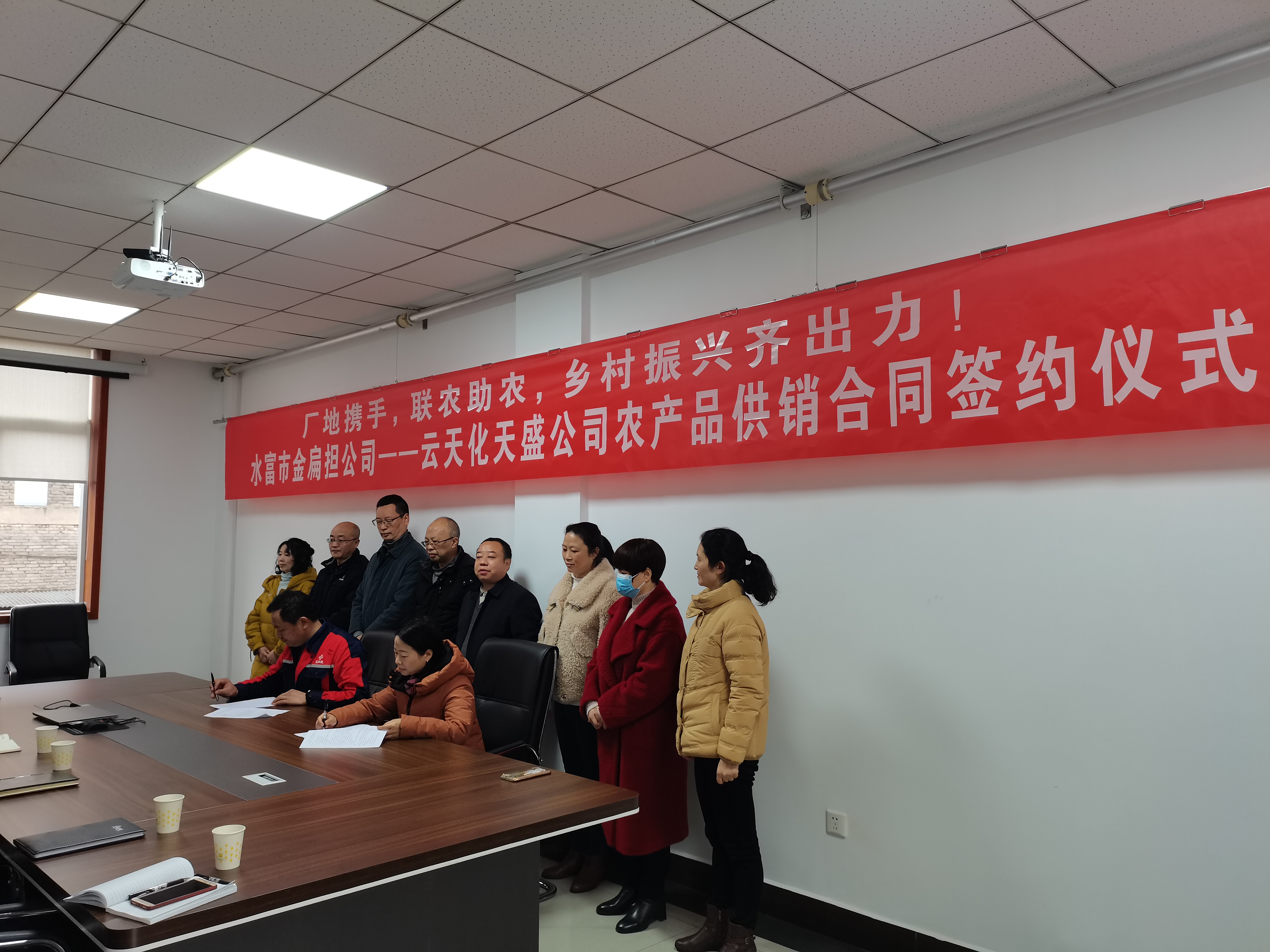 为深入践行党中央实施乡村振兴战略要求,牢记企业使命,勇担社会责任,在水富市委、市政府正确领导下,在水富云天化关心和指导下,天盛公司于2月13日与水富市供销合作社联合社通过磋商达成共识并签署战略合作协议,和水富市金扁担富民商贸有限公司签订了农产品供销合同。供销社主任唐家龙和天盛公司执行董事、总经理何迅以及两个单位相关人员出席签约仪式。