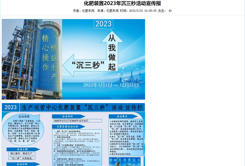 为深入贯彻“长青基业、人为其本,精益生产、达于至善”的公司管理方针,落实集团、股份公司关于推进生产全过程精益化管理的要求,全面围绕“安全、高效、稳定、环保”为中心开展各项工作,强化生产过程管理,培养员工良好的作业习惯,确保公司生产装置的“安、稳、长、满、优”运行。生产运营中心化肥装置根据公司“沉三秒”活动要求,结合化肥自身实际情况,先后出台活动方案并制作电子宣传板报。