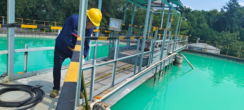 澄清池石灰斗是输送石灰浆液的重要设备。13:50分,装备运维中心人员准备好相关工具,在安全员交代安全后,澄清池石灰斗疏通工作全面展开。由于石灰斗管道狭小,而且有弯道,疏通相对困难,可装备运维中心人员克服困难,在澄清池上干得热火朝天。经过装备运维中心人员近1小时的不懈努力,澄清池石灰斗于14:50分疏通完毕。